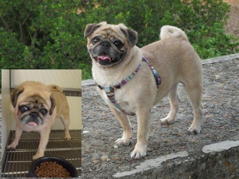 Patches’ adopter proudly shared transformation photos showing a once uncertain pug now settled as a cherished family companion.