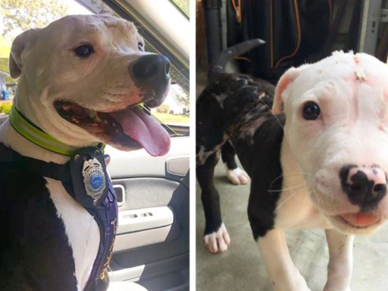 Rescued from a burning shed at three weeks old by firefighter Bill Lindler, Jake healed, was adopted, and now serves proudly as the department mascot with his own badge.