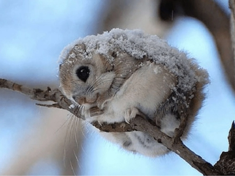 The Japanese flying squirrel, palm sized with bright eyes and a fluffy tail, sleeps in tree hollows by day and glides at night for nuts, seeds, and insects, aiding balance in its woodland ecosystem.