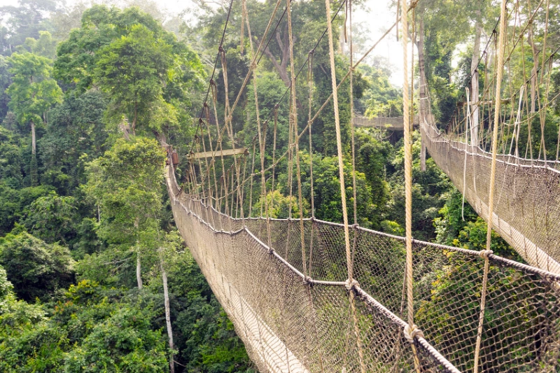 In Kakum National Park the Canopy Walk spans seven treetops offering one of Africa's rare elevated rainforest routes. Visitors observe wildlife and layered greenery from a vantage point few environments provide.