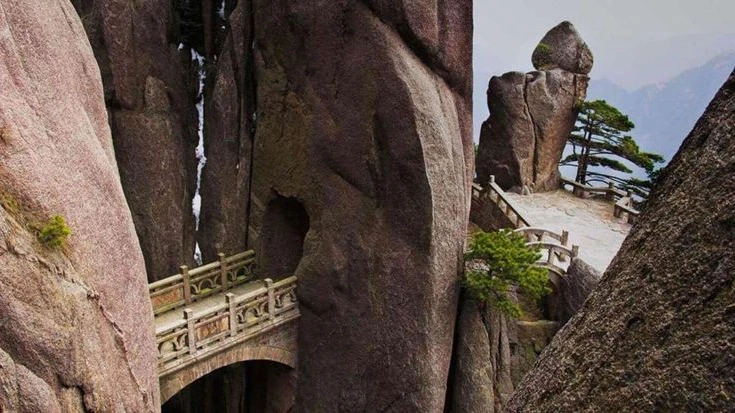The Bridge of the Immortals or Fairyland Bridge is a stone arch linking peaks in Huangshan. Mist drifting through jagged granite gives the passage an ethereal legendary character inviting travelers into a landscape of myth and natural drama.
