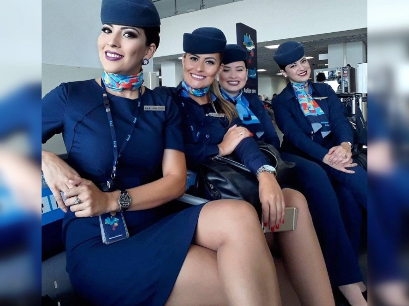 Flight attendants gather before departure projecting coordination and calm. Polished uniforms with scarves or hats add visual unity while relaxed conversation shows team cohesion. Background hints of gates signage or aircraft situate the scene. Their approachability professionalism and mutual support highlight the interpersonal core of aviation service. The portrait reminds viewers that safe travel relies on trained individuals working in sync.