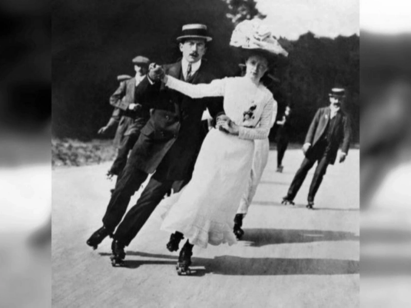 Junge Leute beim Rollschuhlaufen im Jahr 1909. Ihre Kleidung und Haltung wirken aus heutiger Sicht elegant.