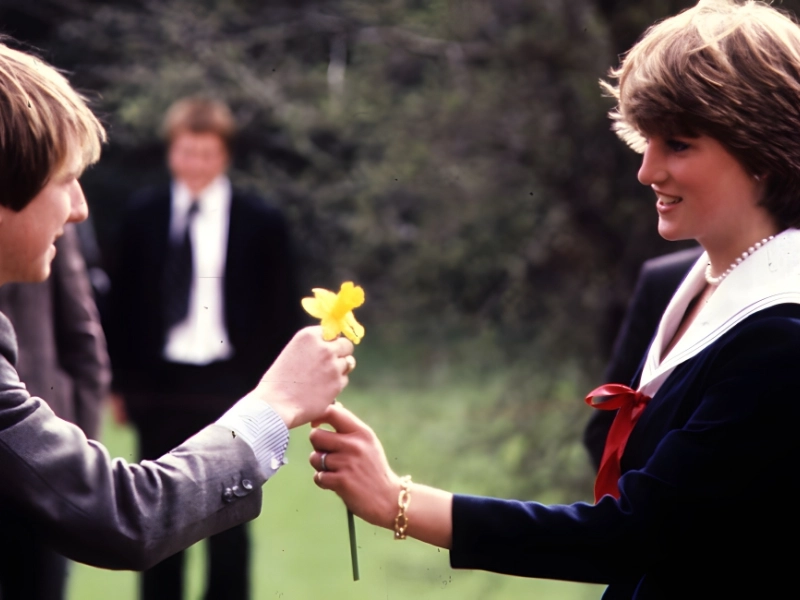 Diana willigte ein. Der Junge legte eine Narzisse in ihre Hand und küsste sie – ein herzzerreißender Moment, dessen Fotos um die Welt gingen. Da er der Erste war, der Dianas Hand öffentlich küsste, wurden ihre Hand und das goldene Kabelarmband zu einem Symbol für ihre mitfühlende und volksnahe Art.
