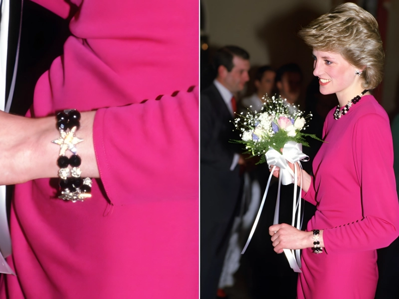 Als die Prinzessin Anfang der 1990er bei einem Supertramp-Konzert fotografiert wurde, trug sie ein Armband mit silbernen Diamantsternen und einer Fülle schwarzer und weißer Steine. Schmuckkenner erkannten sofort, dass Diana ein markantes Stück ihres Lieblingslabels Butler & Wilson zur Schau stellte.