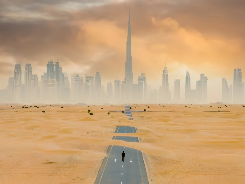 Dieses Luftbild, aufgenommen vom Social-Media-Nutzer @travelwild, prĂ€sentiert Dubai als glanzvolles Juwel der Vereinigten Arabischen Emirate. Nur wenige Skyline-Ansichten sind so spektakulĂ€r wie die von Dubai. Die Metropole erhebt sich aus der rauen SandwĂŒste wie ein hypermodernes Refugium. Der einzelne Mann, der die StraĂe in die Stadt hinuntergeht, verstĂ€rkt den kontrastreichen Eindruck des Bildes.