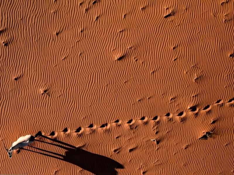 Dieses erstaunliche Bild eines durch die namibische Wüste schreitenden Spießbocks (Gemsbok Oryx) wurde von Martin Harvey aufgenommen. Die dunklen Fußspuren des Oryx heben sich scharf von den roten Sanddünen Namibias ab, die ein bekanntes Merkmal der heißen Wüstenregionen des Landes sind. Für dieses Bild könnte eine Potensic D68 verwendet worden sein, eine Drohne, die sich bei heißem Wetter gut bewährt.