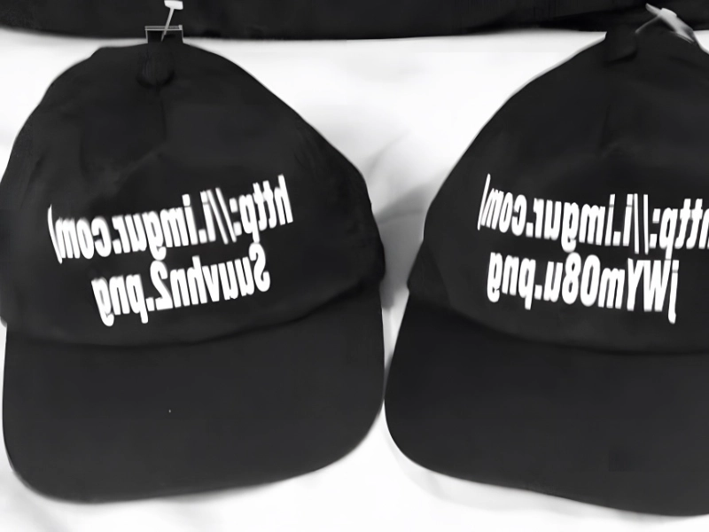 Fans der Serie „Parks & Recreation“ werden Parallelen zu Leslie Knopes schrecklichen Wahlkampfplakaten ziehen. Statt eines aufgedruckten Fotos erhielt ein Kunde schwarze Mützen, auf denen in weißer Schrift lediglich die URL des Bildes – offensichtlich nicht heruntergeladen – stand.