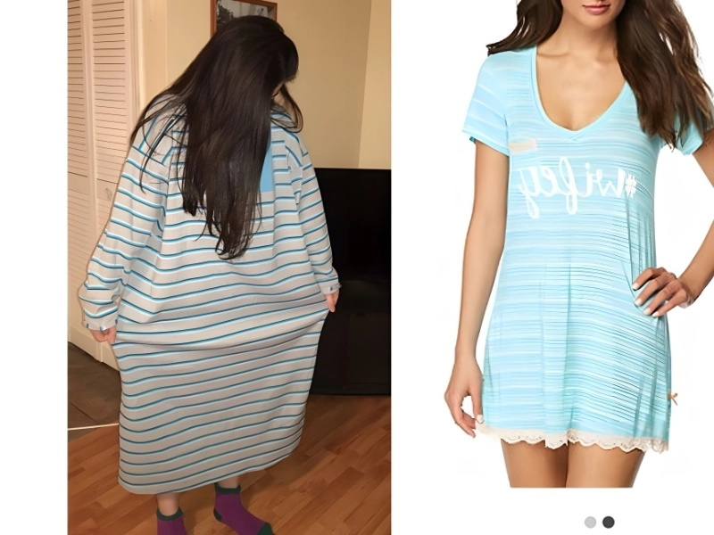 Die Twitter-Nutzerin @faarraahh_ hoffte, ein niedliches „Wifey“-Nachthemd online zu kaufen. Geliefert wurde jedoch etwas, das einem riesigen, langärmeligen T-Shirt ähnelte. Farah hatte ein kurzärmeliges Nachthemd mit blau-weißen Streifen und dem in Schreibschrift aufgedruckten Wort „#Wifey“ auf der Vorderseite bestellt.
