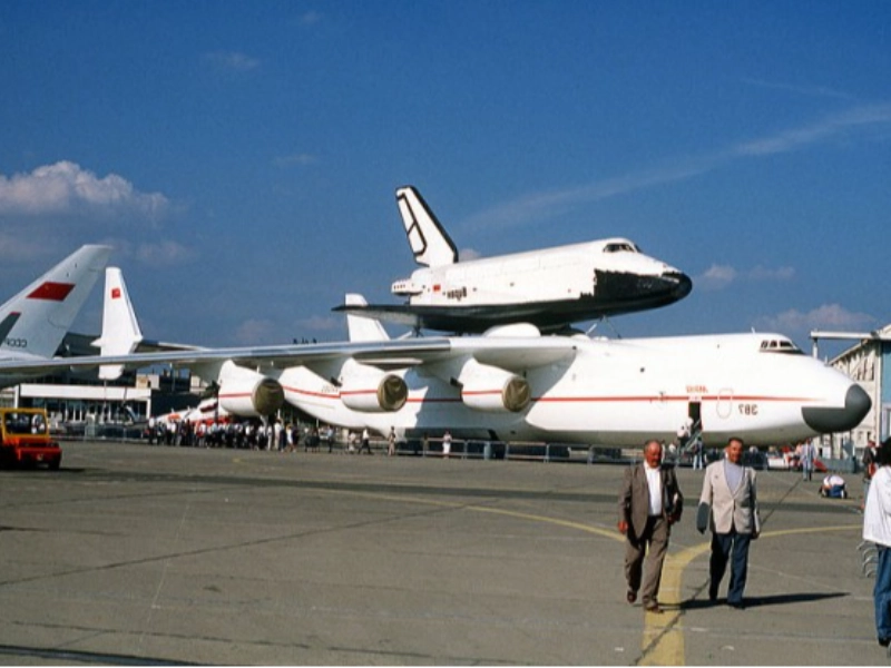 Das Raumfähre Buran wird vom größten Flugzeug der Welt, der An-225 Antonov, transportiert.