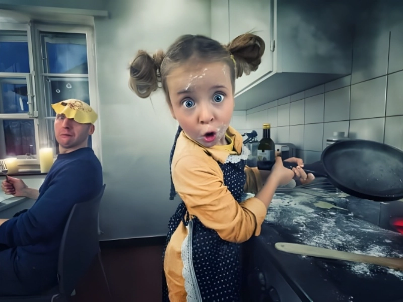 Cette altération d'image habilement créée capture le caractère effréné de la cuisine. Cuisiner peut parfois être une tâche difficile, et les choses peuvent vraiment mal tourner rapidement, surtout en présence de jeunes enfants. Wilhelm montre comment une simple préparation de repas peut devenir une expérience aérienne en capturant avec précision ce chaos domestique. L'image souligne avec légèreté la nécessité d'une conscience spatiale dans la cuisine, où la nourriture devrait idéalement atterrir dans la poêle plutôt que sur la tête de quelqu'un. Bien que les éléments exagérés la rendent à la fois pertinente et merveilleusement drôle, le moment figé dans le temps de cette catastrophe culinaire parle à tous ceux qui ont déjà connu un accident de cuisine.
