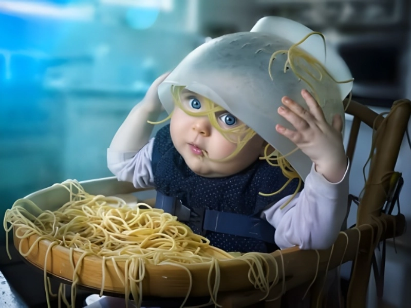 Tout parent connaît le potentiel de catastrophe en mélangeant pâtes et bébés, et cette image capture ce chaos à un tout nouveau niveau. Cette altération photo illustre brillamment la règle d'or : "ne jamais laisser un bébé seul avec des spaghettis". Un tel moment incontrôlé capture toute sa magnificence, et les pâtes semblent défier la gravité et mener leur propre vie. Le désordre qui attend le retour d'un parent imprudent est amplifié à des dimensions humoristiques, avec des brins de spaghetti créant une coiffure complexe digne de tout chef pâtissier. Cet article dépeint merveilleusement la nature erratique des repas des tout-petits et le nettoyage inévitable qui s'ensuit.
