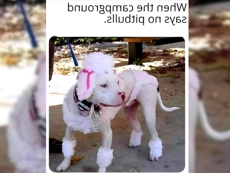 Though often restricted they can be gentle vibrant companions. This rare shot shows a pitbull in a fluffy pink bikini drawing amused glances everywhere.