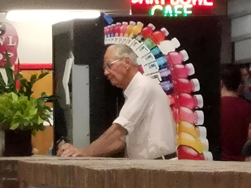 A Unique Promotional Initiative Store freezers serve as chillers and creative ad canvases. They also stage humorous candid photos blending wit and product. A standout image shows an older man posing as a tribal chief with bottles forming a faux headdress. The playful scene amuses while subtly spotlighting the beverages. This mix of humor and placement shows how surprise can build warm brand ties.